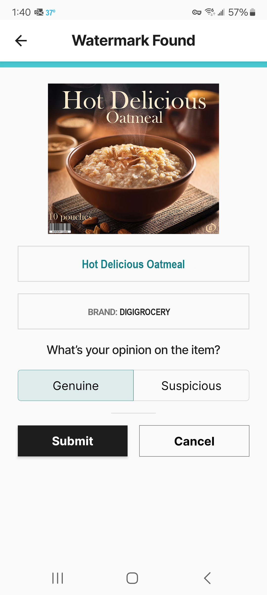 Tap the button to indicate whether you believe the product to be Genuine or Suspicious.