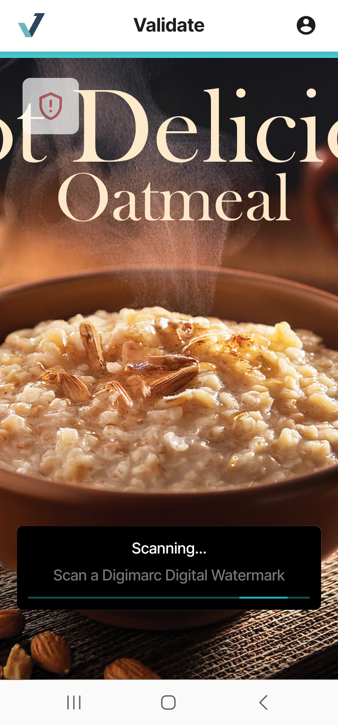 To scan a product, point the rear-facing camera at the product's package. The Validate app scans continuously until it finds a watermark.